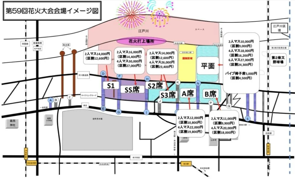 葛飾納涼花火大会の有料席は下記の通りです。