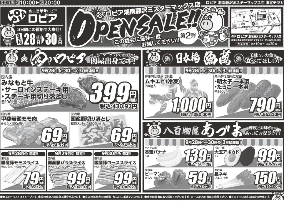 ロピア湘南藤沢ミスターマックス店の『最新のチラシ』2025年9月28日(日)~9月30日(火)を紹介致します。