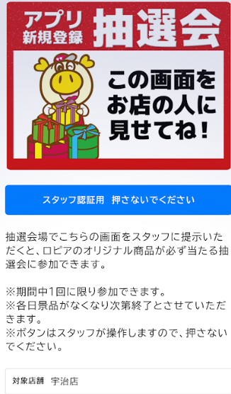 抽選への参加条件はロピアのアプリをダウンロード&宇治店をマイ店舗登録してアプリ画面を提示する事なので、上記の手順でアプリをダウンロードして、ロピア宇治店をマイ店舗登録しておきましょう。